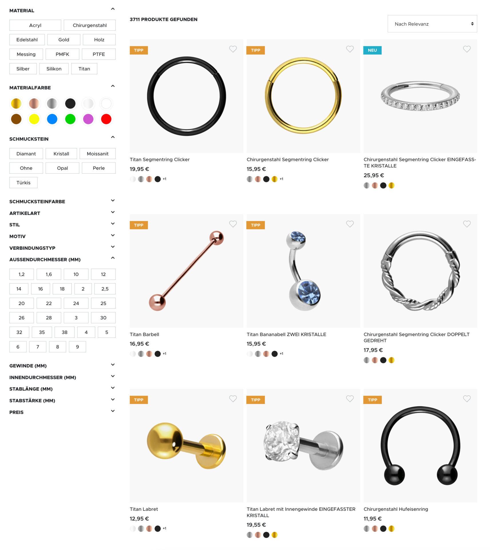 Ein besonderer Fokus lag auf der nahtlosen Integration in Shopware 6. FactFinder liefert Suchergebnisse, Filter, Sortierungen und Kampagnenlogiken, während Preise, Bilder und Verfügbarkeiten weiterhin live aus Shopware kommen. So bleiben alle Inhalte aktuell und das Frontend vollständig kontrollierbar. Das Design der Listings und Produktkacheln folgt weiterhin dem individuellen Piercingline-Theme.