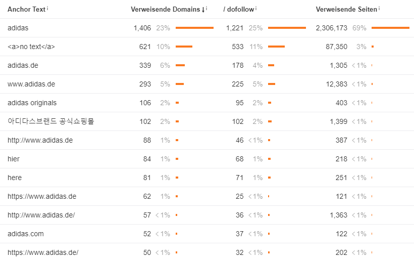 Die Linktexte von adidas sehen sehr gut aus. Der Großteil der Backlinks besteht aus Brand-Anchor Texten und neutrale Linktexte wie “hier”. Somit ist das Profil sehr unauffällig und die Gefahr von Abstrafungen aufgrund unnatürlicher Backlink-Anchor ist nicht gegeben. Das hängt auch damit zusammen, dass ein Großteil der Links direkt auf die Startseite gehen.