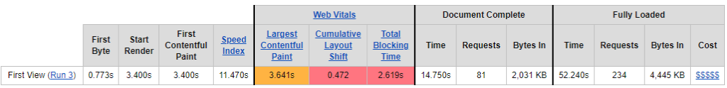 - TBT: Bei der TBT empfiehlt Google einen Wert von weniger als 300 ms. adidas hat einen Wert von 2,619s und liegt stark über der Empfehlung.