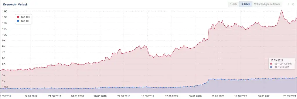 Die Anzahl der Keyword-Rankings ist ebenfalls ein Indikator für den Erfolg der SEO-Strategie. Ein Ranking steht hierbei stellvertretend für einen Suchbegriff, über welche die Website theoretisch gefunden werden kann. Theoretisch deshalb, weil ein Position 19 Ranking zu sehr wenig Traffic führen wird, weil sich kaum ein Nutzer zu Seite 2 von Google navigiert. Daher ist neben der reinen Anzahl an Rankings auch die Position relevant, vor allem die Anzahl der Top-10 Rankings.