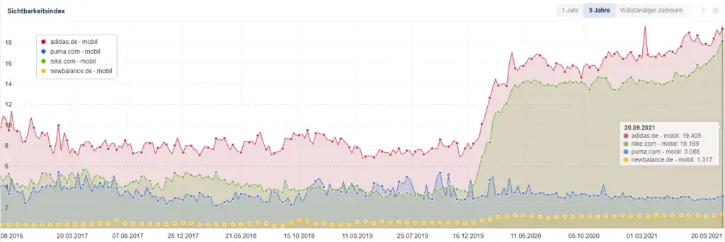 Auch wenn adidas in Sachen Sichtbarkeit ungeschlagener Platzhirsch ist, kann sich nike.com in letzter Zeit immer mehr der Sichtbarkeit von adidas.de annähern. Die Entwicklung sollte daher im Auge behalten werden, nicht das Nike adidas noch überholt und zukünftig mehr Sichtbarkeit hat.