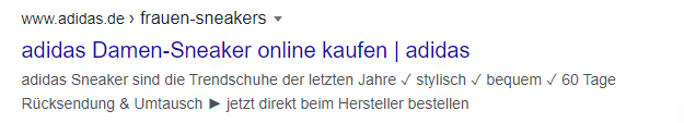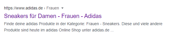 Sowohl Title, als auch Description sind nicht optimal. Der Title enthält den Einschub “Frauen” welcher keinerlei Mehrwert für den Nutzer hat. Die Description ist zu lange und wird ausgepunktet und enthält Informationen, welche für diese Landingpage, nicht sehr relevant sind. Es werden keine ASCII-Zeichen verwendet und zudem ist keine Call-to-Action enthalten. Grundsätzlich wirkt das Snippet, als würde es automatisiert erstellt werden, was bei weniger wichtigen Landingpage durchaus Sinn macht, jedoch bei einer wichtigen Kategorie wie “Damen Sneaker” nicht optimal ist.