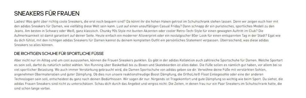 Jedoch ist das gewählte Keyword nicht optimal, da die Keywords “adidas sneaker damen” (Suchvolumen 33.100) und “sneaker damen” (Suchvolumen 135.000) ein deutlich höheres Suchvolumen haben und eigentlich auf diese optimiert werden sollte. Hier sollte ein Content-Audit gemacht werden, um Potentiale aufzudecken und Optimierungsmaßnahmen abzuleiten.