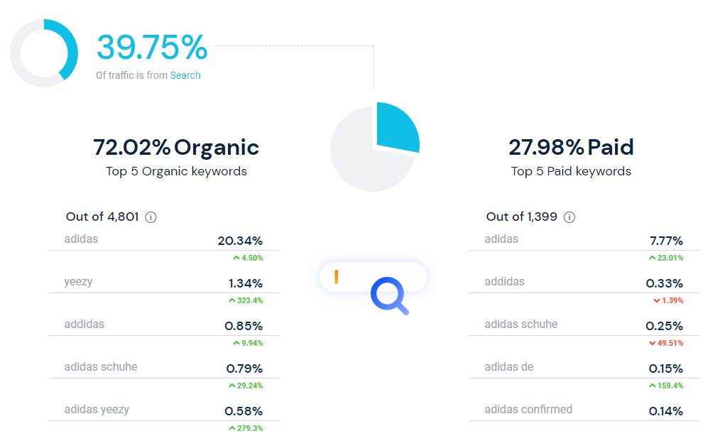 39,75 % des gesamten Traffics wird über Suchmaschinen generiert. Der Suchmaschinen-Traffic wiederum unterteilt sich in Rund 72 % organischen und 28 % bezahlten Traffic.