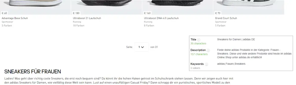 Bei adidas. de werden auch Keywords über das Meta-Keywords-Tag gepflegt, dieses wird jedoch von Suchmaschinen ignoriert und hilft höchstens den Mitbewerbern bei der Keyword-Recherche.
