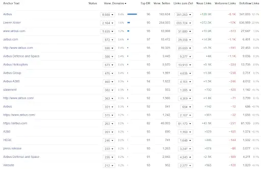 Das Linkprofil ist insgesamt durchschnittlich. Das Domain Rating von airbus ist sehr gut, jedoch hat boeing den exakt gleichen Wert, weshalb hier noch Verbesserungspotential besteht, um sich abzuheben. Die Deeplink Ratio ist ungesund, da ein Großteil der Backlinks auf die Startseite gehen. Hier sollte dringend darauf geachtet werden, dass deep verlinkt wird. . Die Ankertexte sind meist gut gewählt, was hauptsächlich daran liegt dass nur die Startseite verlinkt wird. Zukünftig sollte darauf geachtet werden, dass neutralere Linktexte verwendet werden. . Bei dem Backlink Profil sollten jedoch dringend die schädlichen und potenziell schädlichen Links überprüft werden.