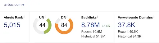 airbus.com hat rund 8,78 Millionen Backlinks und ein Domain Rating von 84. Aufgrund des DR kann man sehen, dass airbus.com eine sehr starke Seite ist. Insgesamt ist das Backlinkprofil stabil und unterliegt nur geringen Schwankungen. Jedoch steigt tendenziell die Anzahl der Backlinks stetig an. Da die Mitbewerber (boeing) ebenfalls ein DR von 84 haben, ergibt sich hier die Chance, durch Ausbauen des Backlink Profils, die Konkurrenz abzuhängen.