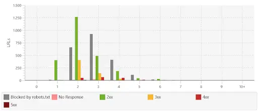 airbus.com hat bei der internen Verlinkung einen sehr guten Job gemacht. Über die facettenreiche Navigation lässt sich fast jede Seite mühelos erreichen. Dies spiegelt sich auch in der oberen Graphik wieder. So sind die meisten URLs bereits nach 3 Klicks zu erreichen, und fast alle URLs können mit maximal 4 Klicks erreicht werden.