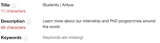 Wie im Abschnitt Keyword-Fokus beschrieben, wurde nicht das optimale Hauptkeyword gewählt. Die Texte sind jedoch gut und bieten auch Mehrwert für den Nutzer, außerdem werden relevante Fragen zu der Bewerbung ebenfalls beantwortet. Allerdingssind die Texte etwas kurz und könnten die angebotenen Stellen noch etwas genauer beschreiben. Zudem werden die Nutzer für mehr Informationen für einige Länder auf eine extra Seite weitergeleitet, wobei die Inhalte dieser Seite noch problemlos auf der Hauptseite Platz hätten. Damit und mit etwas ausführlichen Texten hätte die Suchmaschine, sowie der Nutzer einen Text und eine Seite mit viel Mehrwert zum Thema Internship bei airbus.