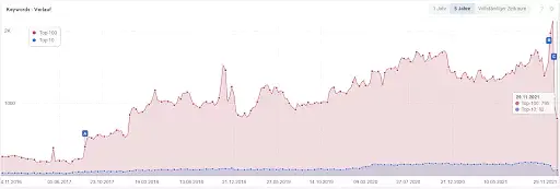 Die Anzahl der Keyword-Rankings ist ebenfalls ein Indikator für den Erfolg der SEO-Strategie. Ein Ranking steht hierbei stellvertretend für einen Suchbegriff, über welche die Website theoretisch gefunden werden kann. Theoretisch deshalb, weil ein Position 19 Ranking zu sehr wenig Traffic führen wird, weil sich kaum ein Nutzer zu Seite 2 von Google navigiert. Daher ist neben der reinen Anzahl an Rankings auch die Position relevant, vor allem die Anzahl der Top-10 Rankings.