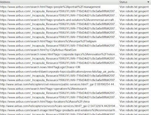 Bei airbus.com gibt es unzählige durch die Suche erzeugte URLs oder URLs von Ressourcen, welche via robots.txt gesperrt sind. Diese wurden alle als nicht indexierbar gekennzeichnet. Diese URLs werden somit nicht gecrawlt. Jedoch sollte über die Search Console überprüft werden, ob die unzähligen von der Suche generierten Seiten nicht doch indexiert werden. Dies ist von außen bei dieser Menge an URLs sehr schwer zu bestimmen.