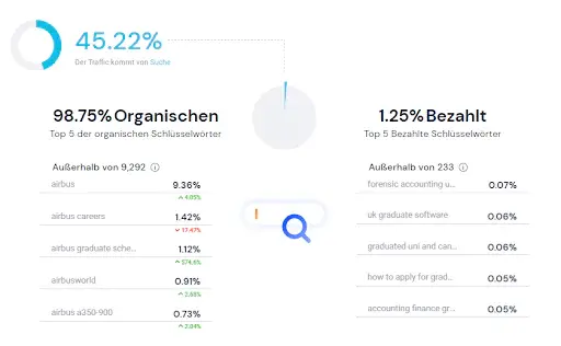 Rund die Hälfte (45,22 %) des gesamten Traffics von airbus.com wird über Suchmaschinen generiert. Dieser Traffic wiederum unterteilt sich in 98,75 % organischen und 1,25 % bezahlten Traffic.