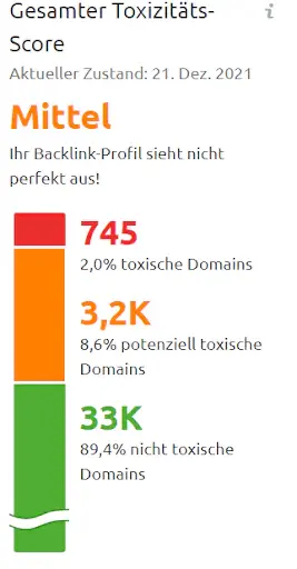Insgesamt wird die Schädlichkeit des Backlinkprofils als Mittel eingestuft, hier besteht also ein wenig Handlungsbedarf. Es sollten 745 Domains, die als toxisch und 3.200 Domains, welche als potentiell schädlich eingeordnet sind geprüft werden.