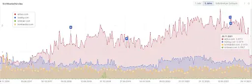 Die Sichtbarkeit von airbus.com stieg in den letzten Jahren kontinuierlich, mit einigen Schwankungen, an und übertrifft die der direkten Konkurrenz eindeutig. Der Abstand zur Konkurrenz konnte auch stetig weiter ausgebaut werden. Jedoch erlitt die Sichtbarkeit Ende Oktober, Anfang November einen deutlichen Einbruch, was sich auf eine Mischung aus einem Google Core Update und wohl einem Relaunch zurückführen lässt. Ende 2021 ist airbus.com wieder auf dem gleichen Sichtbarkeitsniveau wie Oktober 2017.
