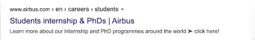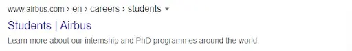 Das gewählte Keyword ist außerdem nicht optimal. Zuerst rankt die Seite nicht für das Keyword Students, da es um internships und PhDs geht. Zum anderen macht es nicht wirklich Sinn für Students ranken zu wollen. Da dies ein sehr generischer Begriff ist. Mehr sinn würde das Keyword “internship” (Suchvolumen 41.000) oder “business internship” (Suchvolumen 2.500) machen. Es gibt jedenfalls noch eine Menge an Traffic Potential bei airbus.com, hier sollte dringend ein Content Audit gemacht werden.