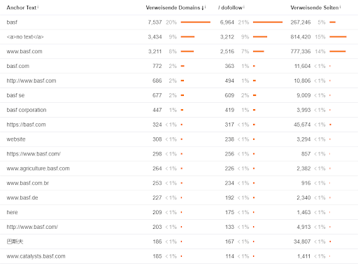 Die Linktexte von BASF sehen sehr gut aus. Der Großteil der Backlinks besteht aus Brand-Anchor Texten und neutrale Linktexte wie “hier”. Somit ist das Profil sehr unauffällig und die Gefahr von Abstrafungen aufgrund unnatürlicher Backlink-Anchor ist nicht gegeben. Das hängt auch damit zusammen, dass ein Großteil der Links direkt auf die Startseite gehen.