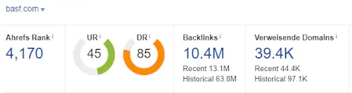 basf.com hat rund 10.4M Backlinks und ein Domain Rating von 85. Aufgrund des DR kann man sehen, dass basf.com eine sehr starke Seite ist. Insgesamt ist das Backlinkprofil stabil und unterliegt nur geringen Schwankungen, jedoch steigt tendenziell die Anzahl der Backlinks stetig an.