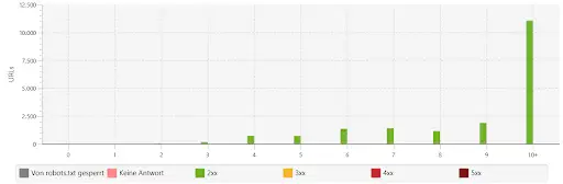 Die mit Abstand meisten Seiten sind erst mit 10 Klicks oder mehr von der Startseite aus zu erreichen. Das ist für Besucher und Suchmaschinen sehr schlecht. Die Seite wirkt dadurch sehr unübersichtlich und die Landingpages können nur über komplizierte Klickwege erreicht werden. Die restlichen URLs sind auch frühestens über 4 Klicks von der Startseite aus zu erreichen, das zeugt von einer insgesamt nicht optimierten internen Verlinkung.