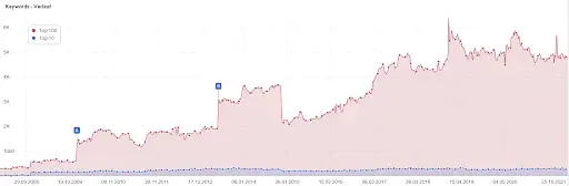 Die Anzahl der Keyword-Rankings ist ebenfalls ein Indikator für den Erfolg der SEO-Strategie. Ein Ranking steht hierbei stellvertretend für einen Suchbegriff, über welche die Website theoretisch gefunden werden kann. Theoretisch deshalb, weil ein Position 19 Ranking zu sehr wenig Traffic führen wird, weil sich kaum ein Nutzer zu Seite 2 von Google navigiert. Daher ist neben der reinen Anzahl an Rankings auch die Position relevant, vor allem die Anzahl der Top-10 Rankings.