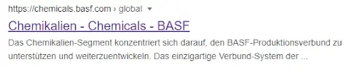 Sowohl Title, als auch Description sind überhaupt nicht optimiert. Der Title enthält den Einschub “Chemicals” welcher keinerlei Mehrwert für den Nutzer hat. Die Description ist zu lange und wird ausgepunktet und enthält Informationen, welche für diese Landingpage, nicht sehr relevant sind. Es werden keine ASCII-Zeichen verwendet und zudem ist keine Call-to-Action enthalten. Grundsätzlich wirkt das Snippet, als würde es automatisiert erstellt werden, was bei weniger wichtigen Landingpage durchaus Sinn macht, jedoch bei einer wichtigen Kategorie wie “Chemikalien” nicht optimal ist.