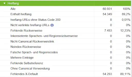 Wie im Screenshot aus Screaming Frog zu sehen, ist auf 89 % der Seiten kein x-default ausgezeichnet. Das sollte dringend nachgeholt werden. Auf 12 % der Seiten von basf.com fehlt der Rückverweis. Das heißt, dass eine URL zwar auf die Seite verweist, diese jedoch nicht zurück verweist. Damit die Suchmaschinen die einzelnen Sprachversionen richtig zuordnen können, sollten die hreflang-Tags korrekt ausgezeichnet werden.