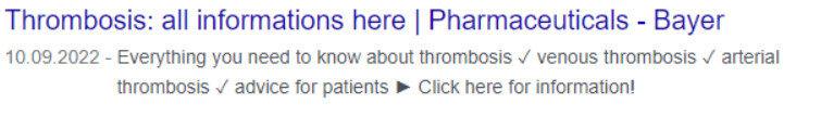 Bayer.com legt Wert auf einen Keyword-Fokus. Wie im Beispiel zu sehen, ist diese Landingpage auf das Hauptkeyword “Thrombosis” optimiert. Dieses kommt sowohl in Title, Description, als auch der H1 vor und enthält ebenfalls Long-Tail Variationen, wie “venous thrombosis” und “arterial thrombosis”.