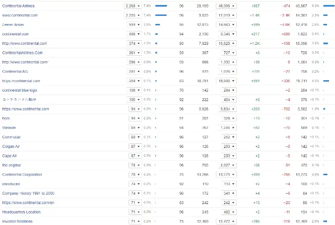 Dennoch rankt continental.com für 1.062 Keywords auf Position 1, welche ein Suchvolumen zwischen 45.400 und 0 besitzen. Hier sind auch für einige branchenspezifische generische Keywords zu finden, welche relevante Rankings darstellen: