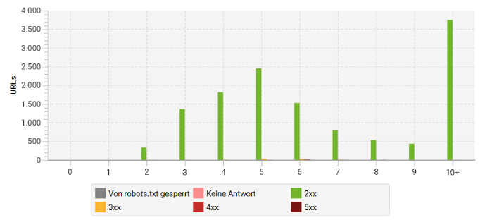 Die Linktiefe bei continental.com ist insgesamt nicht optimal – die Mehrheit der Seiten sind erst nach 10 oder mehr Ebenen erreichbar und nur wenige Seiten verteilen sich auf Ebene 2 und 3. Dies ist für den User sehr aufwendig und verringert die Userexperience, außerdem wird dadurch wertvolles Crawling-Budget verschwendet. Da die Seite von Continental auf holistischen Content fokussiert ist und nicht der Kauf oder eine Bestellung im Mittelpunkt steht, sollte auf eine geringe Klicktiefe geachtet werden, damit der User schon mit wenigen Klicks die gewünschte Information finden kann.