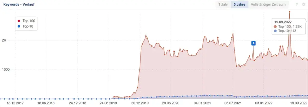 Die Anzahl der Keyword-Rankings ist ebenfalls ein Indikator für den Erfolg der SEO-Strategie. Ein Ranking steht hierbei stellvertretend für einen Suchbegriff, über welche die Website theoretisch gefunden werden kann. Theoretisch deshalb, weil ein Position 19 Ranking zu sehr wenig Traffic führen wird, da sich kaum Nutzer zu Seite 2 von Google navigieren. Daher ist neben der reinen Anzahl an Rankings auch die Position relevant, vor allem die Anzahl der Top-10 Rankings.