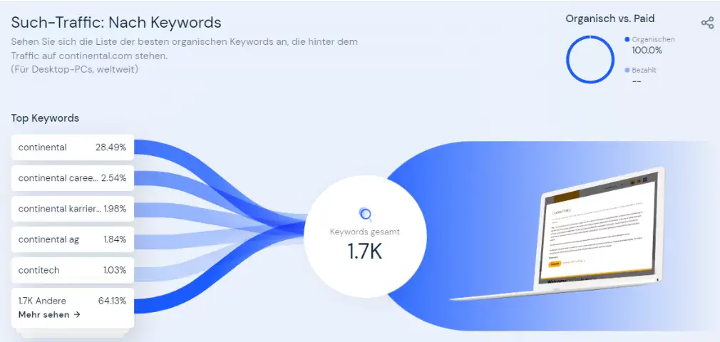 63,67% des gesamten Traffics wird über die organische Suche generiert. Der nächste Konkurrent hinsichtlich der Sichtbarkeit ist michelin.de – hier ist der Anteil des organischen Traffics mit ~85 % deutlich größer als bei continental.com.