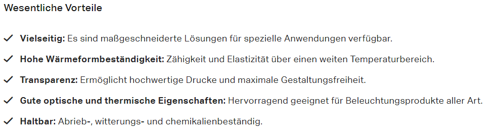 Wie im Abschnitt Keyword-Fokus beschrieben, wurde für viele Seiten nicht das optimale Hauptkeyword gewählt. Im o. g. Beispiel für “Makrofol” wurden die Keywords im Text allerdings gut umgesetzt. Der Text ist dennoch etwas kurz und bietet dem Nutzer nicht genügend Mehrwert. Covestro geht im o. g. Beispiel stark auf die Vorteile des Produktes ein, auch mit einer übersichtlichen Aufzählung der Vorteile.