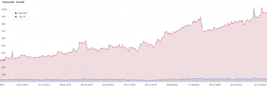 Die Anzahl der Keyword-Rankings ist ebenfalls ein Indikator für den Erfolg der SEO-Strategie. Ein Ranking steht hierbei stellvertretend für einen Suchbegriff, über welche die Website theoretisch gefunden werden kann. Theoretisch deshalb, weil ein Position 19 Ranking zu sehr wenig Traffic führen wird, weil sich kaum ein Nutzer zu Seite 2 von Google navigiert. Daher ist neben der reinen Anzahl an Rankings auch die Position relevant, vor allem die Anzahl der Top-10 Rankings.