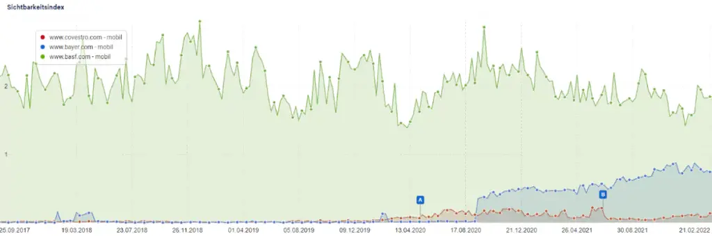 Auch wenn Covestros Sichtbarkeitindex aktuell wieder steigt ist dieser im Vergleich zu den Konkurrenten BASF und Bayer schwach. Demnach sollten dringend Maßnahmen geplant werden, um zukünftig mehr Sichtbarkeit zu erlangen.