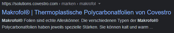 Zudem werden in der Meta Description keine ASCII-Zeichen verwendet und es ist keine Call-to-Action enthalten. Grundsätzlich wirkt das Snippet, als würde es automatisiert erstellt werden, was bei weniger wichtigen Landingpage durchaus Sinn macht. In unserem Fall wurde als Meta Description ein Teil aus dem Text “Makrofol” herauskopiert.
