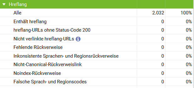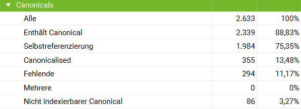 Der Canonical Tag fehlt auf 294 Seiten. Um Duplicate Content zu vermeiden, sollte dieser auf allen Seiten ausgezeichnet werden. Auch ein selbstreferenzierender Canonical (ein Canonical der URL mit dem Inhalt der eigenen URL) ist empfehlenswert um sicherzustellen, dass es sich um die Original-Ressource handelt, selbst wenn es keine Duplikate gibt. Dieses Kriterium erfüllen nur 75,35 % der Seiten. Die anderen URLs haben also entweder keinen Canonical, oder verweisen auf andere Seiten. Oberflächlich betrachtet sind also nur 75,35 % und mit vielem guten willen noch die 11,17 % URLs ohne Canonical relevant. Die restlichen rund 13,48 % wären also irrelevant. Viele nicht kanonische URLs betreffen die verschiedenen Sprachversionen, das wäre nicht nötig, wäre der hreflang-Tag gepflegt. Den Suchmaschinen wird dadurch empfohlen, die Sprachversionen nicht zu indexieren, da es sich um Duplikate handelt. Hier wird der Canonical-Tag falsch verwendet, was dazu führen kann, dass der Canonical seitenweit ignoriert wird. Das ist sehr problematisch und kann problemlos mit dem hreflang-Tag in den Griff bekommen werden. Hier besteht dringender Handlungsbedarf.