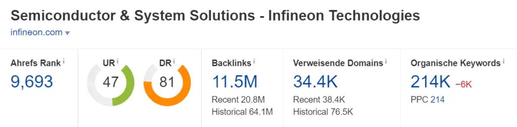 infineon.com hat rund 11.5M Backlinks und ein Domain Rating von 81. Aufgrund des DR kann man sehen, dass infineon.com eine sehr starke Seite ist. Insgesamt ist das Backlinkprofil stabil und unterliegt nur geringen Schwankungen, jedoch steigt tendenziell die Anzahl der Backlinks stetig an. Da die Mitbewerber weniger Domain Rating haben, ist Infineon hier sehr gut aufgestellt.