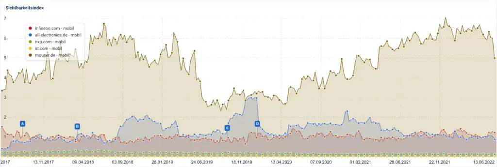 Ungeschlagen auf Platz 1 ist der Konkurrent mouser.de. Hier ist ein großer Vorsprung entstanden, der aufgeholt werden sollte. Allerdings zeigt dies auch das riesige Potential in diesem Bereich auf. Hier könnte man sich mit gezielten Optimierungen dem Konkurrenten bezüglich der Sichtbarkeit annähern..