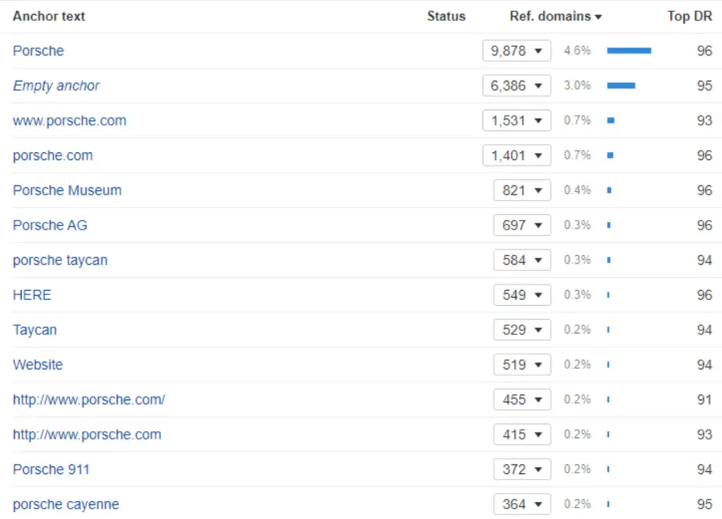 Die Anchor von porsche.com sind OKn. Der größte Anteil der Ankertexte sind Brand-Keywords oder es existieren erst gar keine Ankertexte. Somit muss Porsche an dieser Stelle keine Ranking-Abstrafung fürchten. Allerdings sollte aufgepasst werden, dass Produktnamen wie “Porsche Taycan” nicht zu oft als externer Linktext verwendet werden.