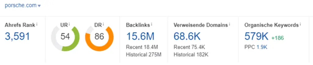 porsche.com hat ca. 15,6 Millionen Backlinks und ein Domain Rating von 86. Daran lässt sich ablesen, dass porsche.com eine vergleichsweise hohe Domain-Autorität besitzt. Im Klartext bedeutet das, dass viele seriöse und ebenfalls starke Domains auf eine Landingpage von porsche.com verlinken und porsche.com somit ebenfalls als seriöse Domain ausweisen. Die 15,6 Millionen Backlinks verteilen sich auf ca. 5 Millionen verweisende Seiten. Bei dieser Kennzahl musste Porsche Mitte 2018 einen massiven Einbruch verzeichnen (von ca. 8,5 auf ca. 3 Millionen verweisende Seiten). Seitdem unterliegt der Wert Schwankungen, zeigt im letzten Trend jedoch wieder leicht nach oben. Fraglich ist, welche Art von Backlinks in dieser Zeit verloren gegangen sind. Möglicherweise hat es sich um toxische URLs gehandelt, die von porsche.com (zurecht) entfernt wurden. Dies zu prüfen würde jedoch den Rahmen dieser Analyse sprengen.