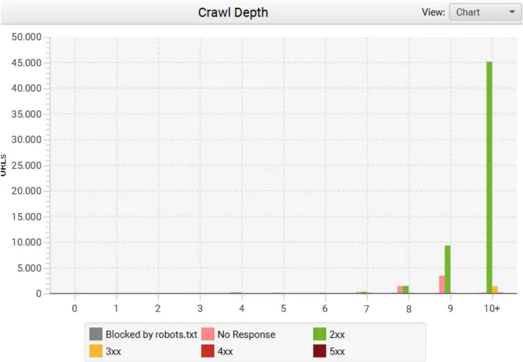 Es fällt auf, dass viele URLs der Domain porsche.com erst auf Ebene 10 oder höher auffindbar sind. Dies ist nicht optimal, da das Crawlingbudget unnötig verbraucht wird und auch die User selbst durch viele Pfade navigieren müssen, um zur Ziel-URL zu gelangen. Hier sollte man jedoch betonen, dass Screaming Frog nicht alle URLs analysiert hat. Viele URLs sind schnell abrufbar und können von der Startseite aus mit wenigen Klicks angesteuert werden.