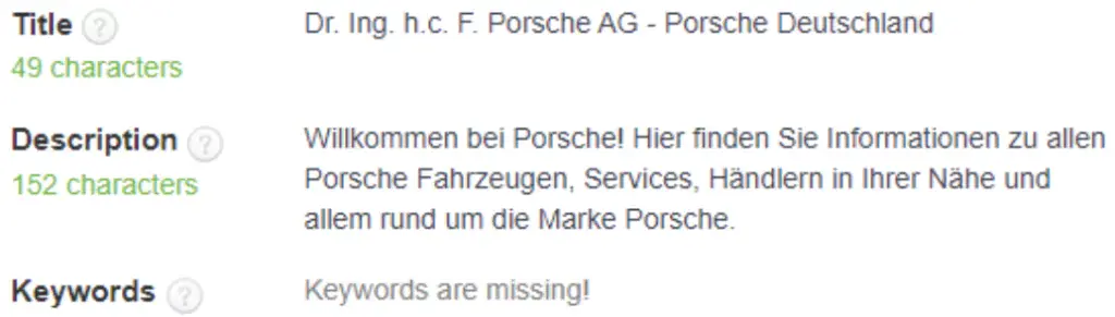 Wie bereits im Kapitel “Rankings” festgestellt, sind für porsche.com hauptsächlich Brand-Keywords relevant. Sofern Meta Description, H1 oder Title vorhanden, werden dort auch relevante Keywords von Porsche verwendet. Insgesamt sollte Porsche jedoch Titles, Descriptions und Überschriften optimieren, um ihre URL-Inhalte eindeutig zu kennzeichnen und somit der Suchmaschine und dem Seitenbesucher Informationen schneller übermitteln zu können.