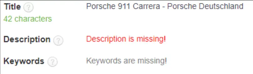 Porsche.com pflegt größtenteils keine Keywords über den Meta-Keyords-Tag. Das ist positiv zu bewerten, da relevante Keywords immer direkt in H1, Titles und Descriptions eingebaut werden sollten. Die Verwendung von H1-Überschriften und Meta Descriptions erfolgt bei porsche.com nur inkonsistent. Beispielsweise haben über 50 % der URLs keine gepflegte Meta Description und ca. 9,5 % besitzen keine H1-Überschrift. Das ist problematisch, da Meta Descriptions und H1-Headlines sowohl dem Nutzer, als auch der Suchmaschine dabei helfen, die korrekten Inhalte der jeweiligen Seite schnell zu erkennen und zu verstehen. Existiert keine Meta Description für eine URL, generiert die Suchmaschine eine Beschreibung anhand der Inhalte auf der Seite. Häufig ist diese Beschreibung allerdings inhaltlich nicht zutreffend und zu lang, sodass sie in den SERPs unvollständig ausgespielt wird.