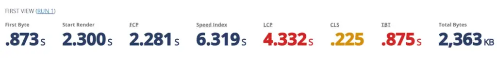 - TBT: Bei der TBT empfiehlt Google einen Wert von weniger als 300ms. Auf dieser Landingpage beträgt die TBT 875ms und ist damit fast 3x so hoch wie der kritische Schwellenwert.