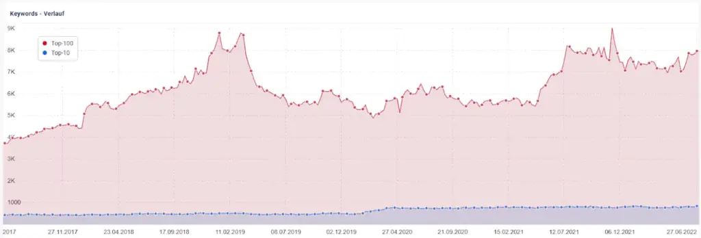 Die Anzahl der Keyword-Rankings ist ebenfalls ein Indikator für den Erfolg der SEO-Strategie. Ein Ranking steht hierbei stellvertretend für einen Suchbegriff, über welche die Website theoretisch gefunden werden kann. Theoretisch deshalb, weil ein Position 19 Ranking zu sehr wenig Traffic führen wird, weil sich kaum ein Nutzer zu Seite 2 von Google navigiert. Daher ist neben der reinen Anzahl an Rankings auch die Position relevant, vor allem die Anzahl der Top-10 Rankings.