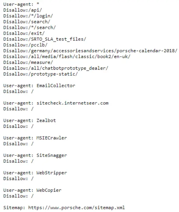 Die robots.txt von Porsche sperrt hauptsächlich “Login-” und “Password Recovery”-URLs. Die ist sinnvoll, da solche URLs nicht relevant für den Crawler sind und nicht indexiert werden sollten. Ein Blick in die robots.txt offenbart außerdem, dass weitere Verzeichnisse, wie zB. “Search” dringend ausgeschlossen werden sollen. Auffällig ist das Disallowing von sehr spezifischen Pfaden wie “/germany/accessoriesandservices/porsche-calendar-2018/”.