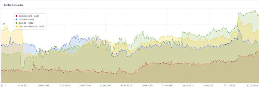Es bleibt festzustellen, dass die Sichtbarkeit von porsche.com definitiv ausbaufähig ist. Im Vergleich zur direkten Konkurrenz liegt die Domain auf dem letzten Platz und sollte hinsichtlich Sichtbarkeit optimiert werden.