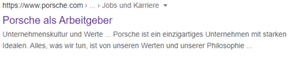 Ein Snippet, welches keine gepflegte Meta Description beinhaltet, wird für die Seite “Jobs und Karriere” ausgespielt. Die von Google generierte Beschreibung folgt keinem schlüssigen Aufbau, beginnt mit einer alleinstehenden Überschrift und stellt einen Ausschnitt aus einem auf der Landingpage hinterlegten Text dar. Auch hier fehlt eine ansprechende, optimierte Beschreibung um dem Nutzer sofort zu signalisieren, was er auf dieser Landingpage findet und wieso er dort unbedingt klicken sollte.