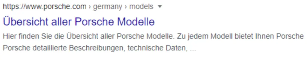 Die Snippets sollten größtenteils von porsche.com optimiert werden. Wichtigster Ansatzpunkt sind die Meta Descriptions, um Klarheit für die von Porsche bereitgestellten Inhalte zu schaffen. Auch Suchmaschinen werden deutlich einfacher Inhalte erkennen, wenn eine gute und saubere Beschreibung der Inhalte der URL hinterlegt ist.