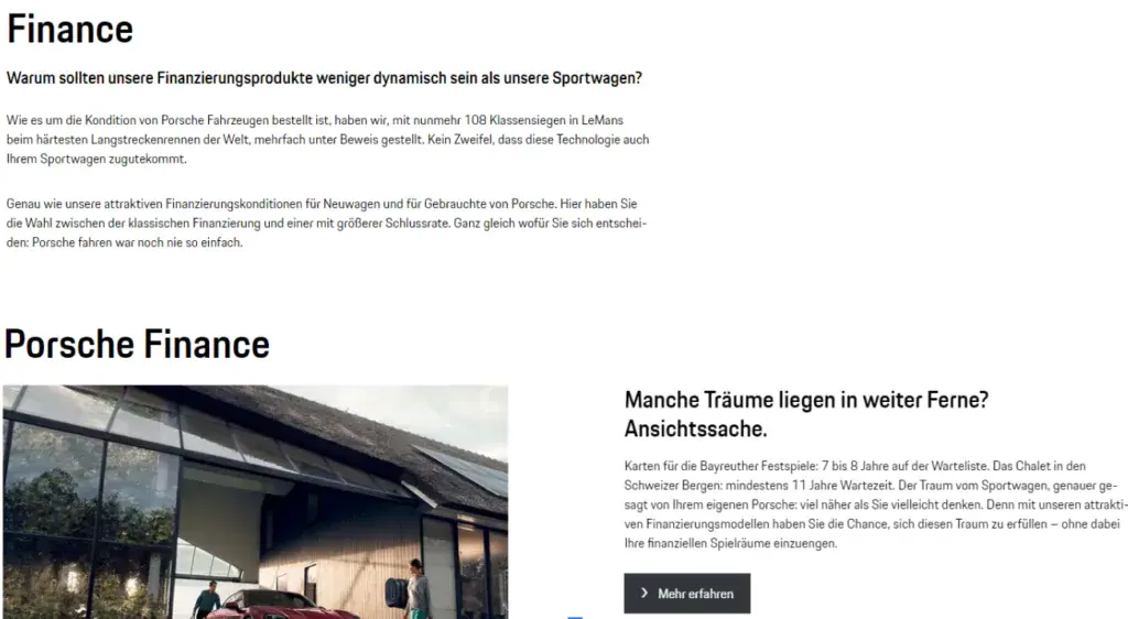 Wichtig für gelungene Texte ist vor allem ein Bezug zur Thematik, die Verwendung relevanter Keywords und die richtige Tonalität der Ansprache an potentielle Kunden oder Nutzer. Porsche.com überzeugt mit prägnanten Texten, die den Nutzer in kurzer, aber informativer Form, abholen und Inhalte vermitteln. Relevante Keywords sind platziert und stellen einen Bezug zur übergeordneten Thematik her.