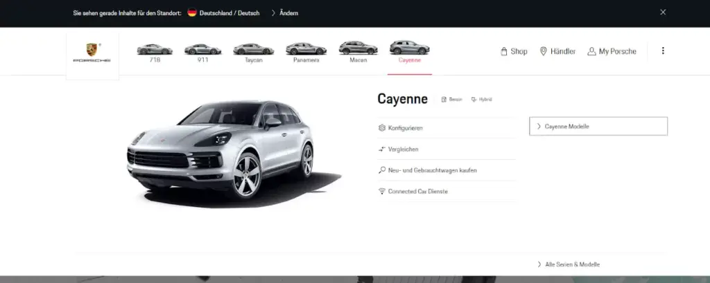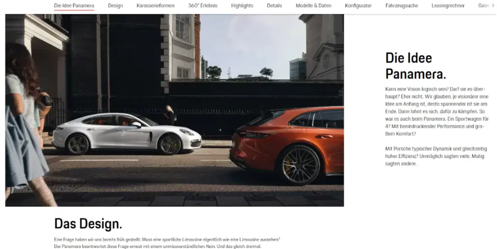 Relevante Informationen zu allen Modellen finden Nutzer direkt im Header der Startseite. Die Landingpages der einzelnen Modelle sind ebenfalls sehr schön designt, das Nutzererlebnis steht hier klar im Vordergrund. USPs der Fahrzeuge und das Schaffen eines Bewusstseins für die Marke Porsche verleihen den Landingpages einen informativen, und erlebnisreichen Charakter. Hier kann porsche.com durchaus überzeugen.